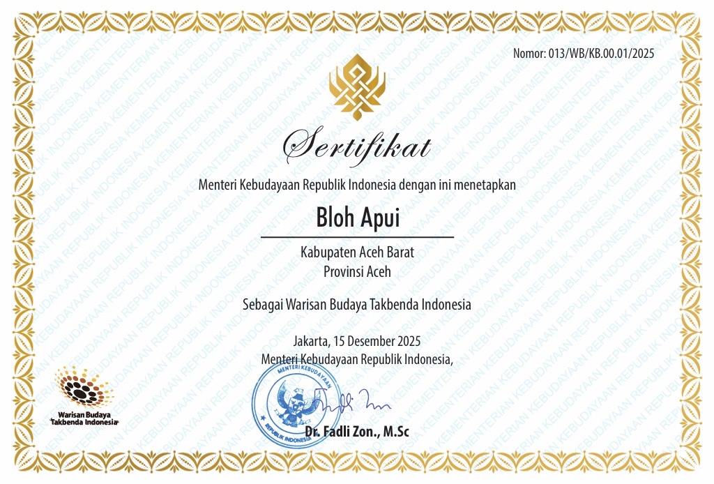 ACEH BARAT (Meulabohnews) — Kesenian tradisional Bloh Apui dari Kabupaten Aceh Barat resmi ditetapkan sebagai Warisan Budaya Takbenda Indonesia (WBTbI) oleh Kementerian Kebudayaan Republik Indonesia. Penetapan tersebut tertuang dalam sertifikat yang ditandatangani Menteri Kebudayaan, Fadli Zon, pada 15 Desember 2025 di Jakarta.
