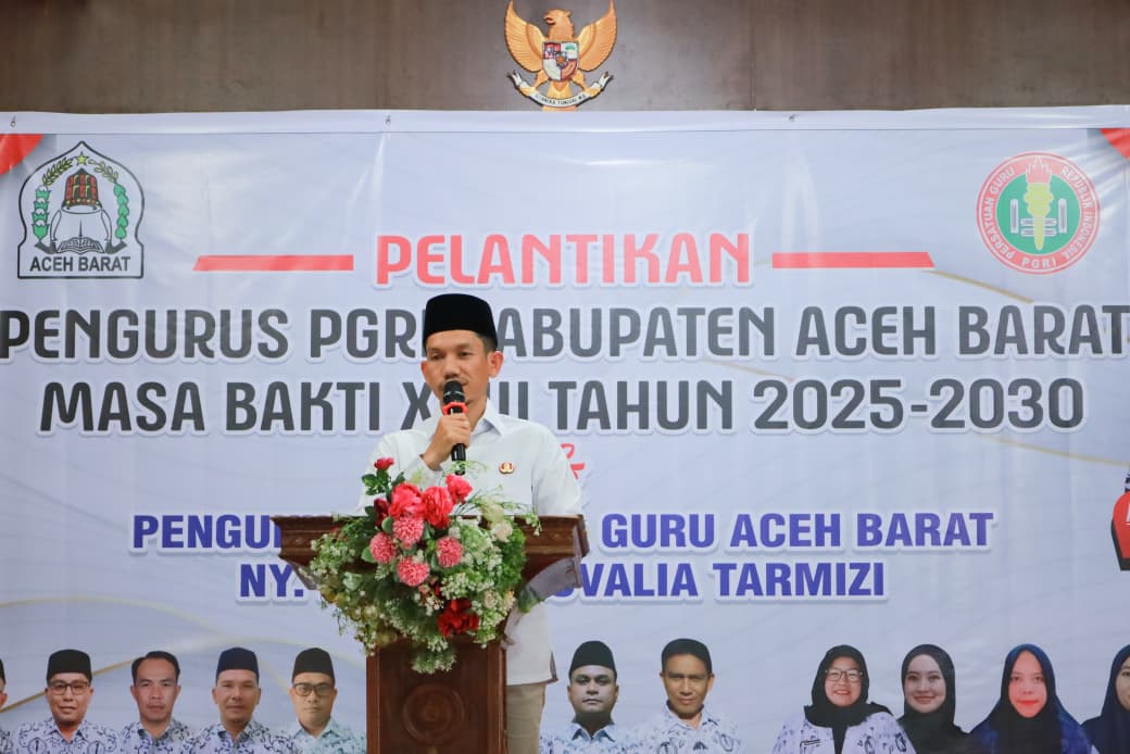Meulabohnews: Bupati Aceh Barat, Tarmizi SP, MM menghadiri pelantikan pengurus Persatuan Guru Republik Indonesia (PGRI) Aceh Barat masa bakti XXIII Tahun 2025 – 2030, dan mengukuhkan Ny Afrinda Novalia sebagai Ibunda Guru Aceh Barat di Aula Gedung B Disdikbud setempat pada Sabtu (17/1/2026).