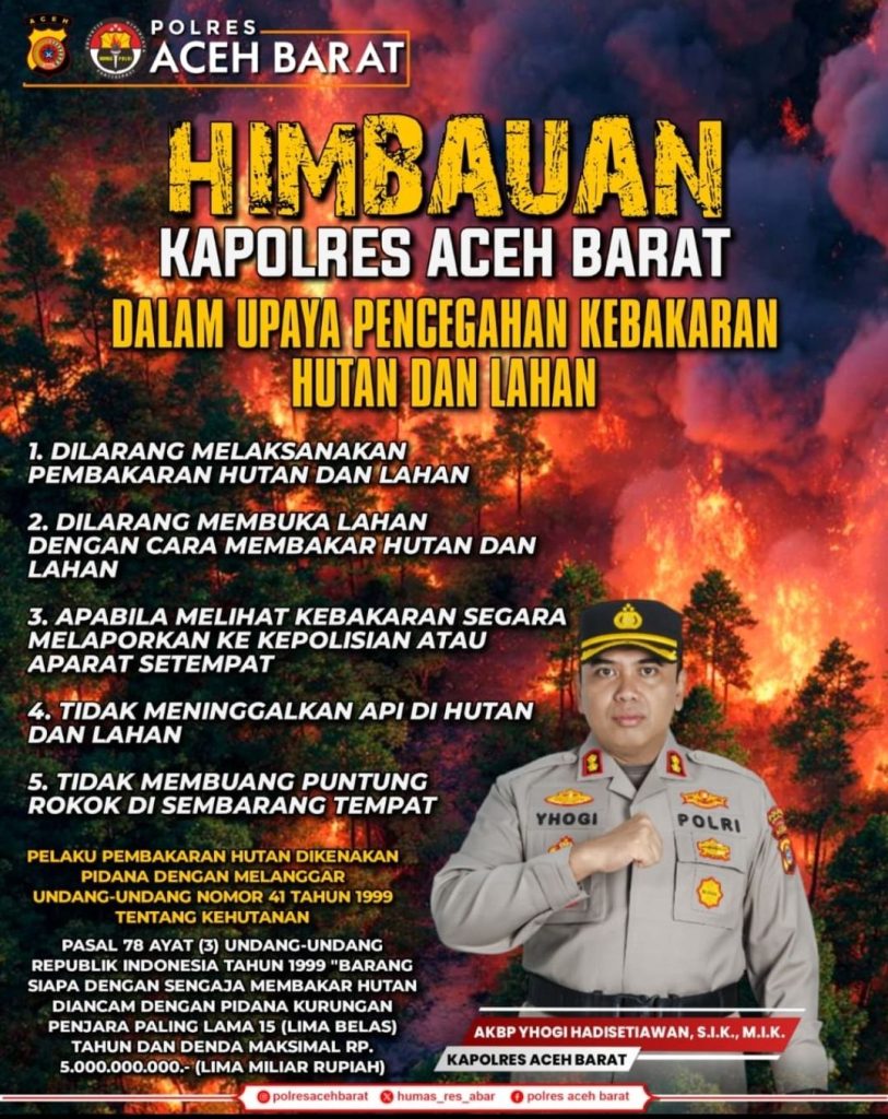 Meulabohnews: Kapolres Aceh Barat AKBP Yhogi Hadisetiawan mengeluarkan imbauan kepada seluruh masyarakat untuk tidak melakukan pembakaran hutan dan lahan (karhutla) sebagai upaya pencegahan bencana kebakaran di wilayah Aceh Barat.