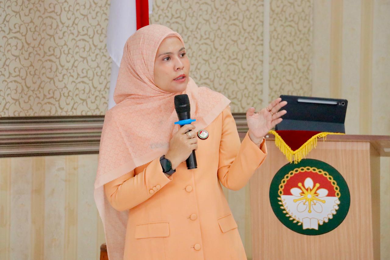 Pelaksana Tugas (Plt) Ketua DWP Kabupaten Aceh Barat, Cut Zufahnur Syafitri saat memaparkan materi dalam Rapat Kerja tahunan di sekretariat DWP, komplek kantor bupati setempat pada Jumat (23/1/226).