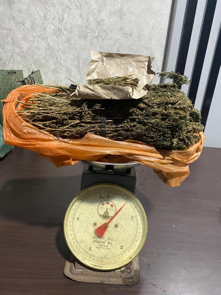 Saat dilakukan penggeledahan terhadap tersangka, petugas menemukan satu bungkus kantong plastik besar dan satu bungkus kertas nasi kecil yang keduanya diduga berisikan narkotika jenis ganja dengan berat bruto kurang lebih 500 gram atau setengah kilo.
