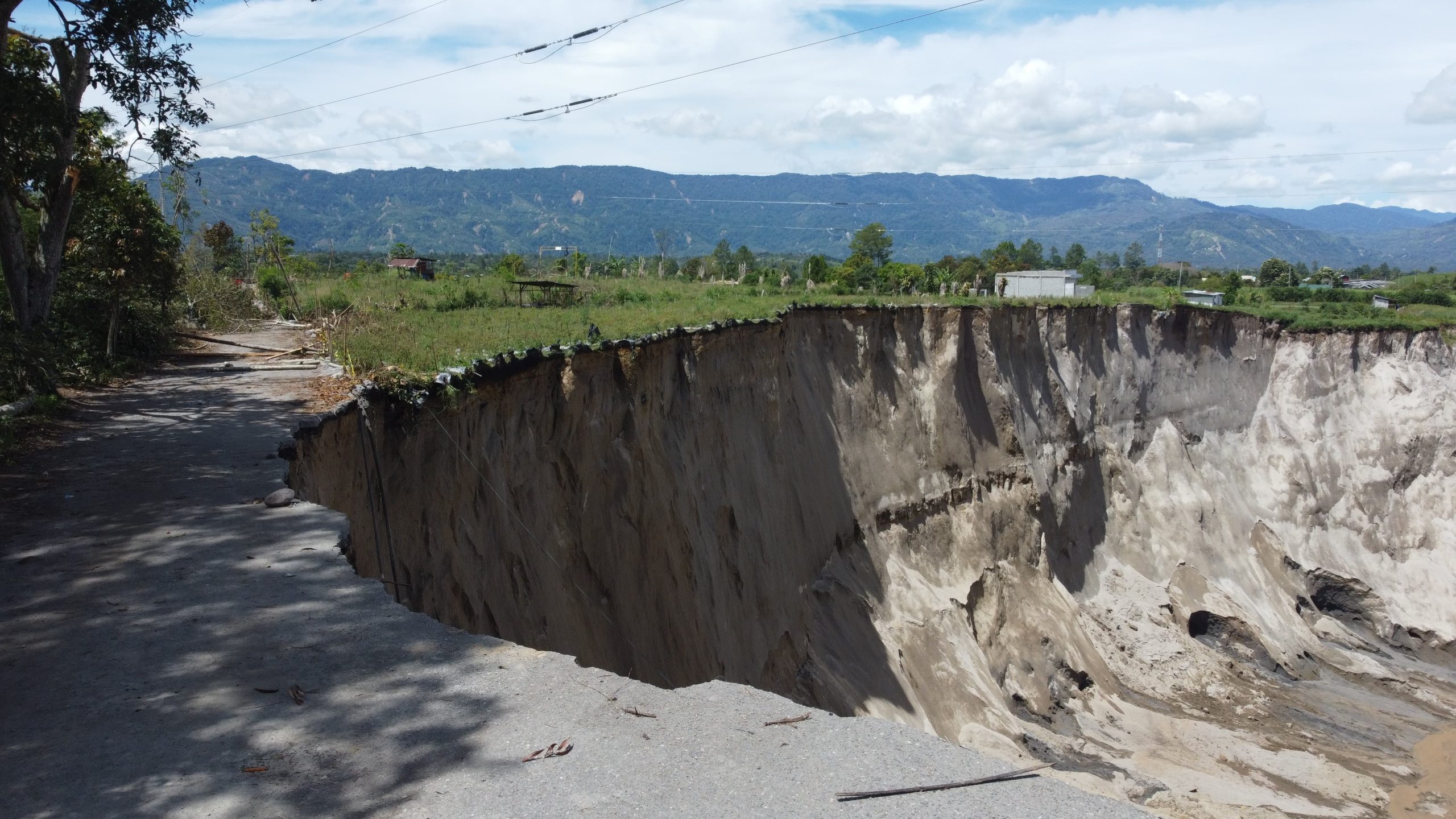 Aceh Tengah (Meulabohnews) – Penampakan kondisi terkini Sinkhole di Desa Pondok Balik, Kecamatan Ketol, Aceh Tengah udara via drone semakin meluas. Longsoran aktif sejak dua lalu itu kian masih yang menelan belasan hektar kebun warga, jalan lintas Kabupaten Aceh Tengah – Bener Meriah terputus dan tower SUTET milik PLN terpaksa di pindahkan.Foto direkam beberapa waktu lalu.(Foto: Yulham)