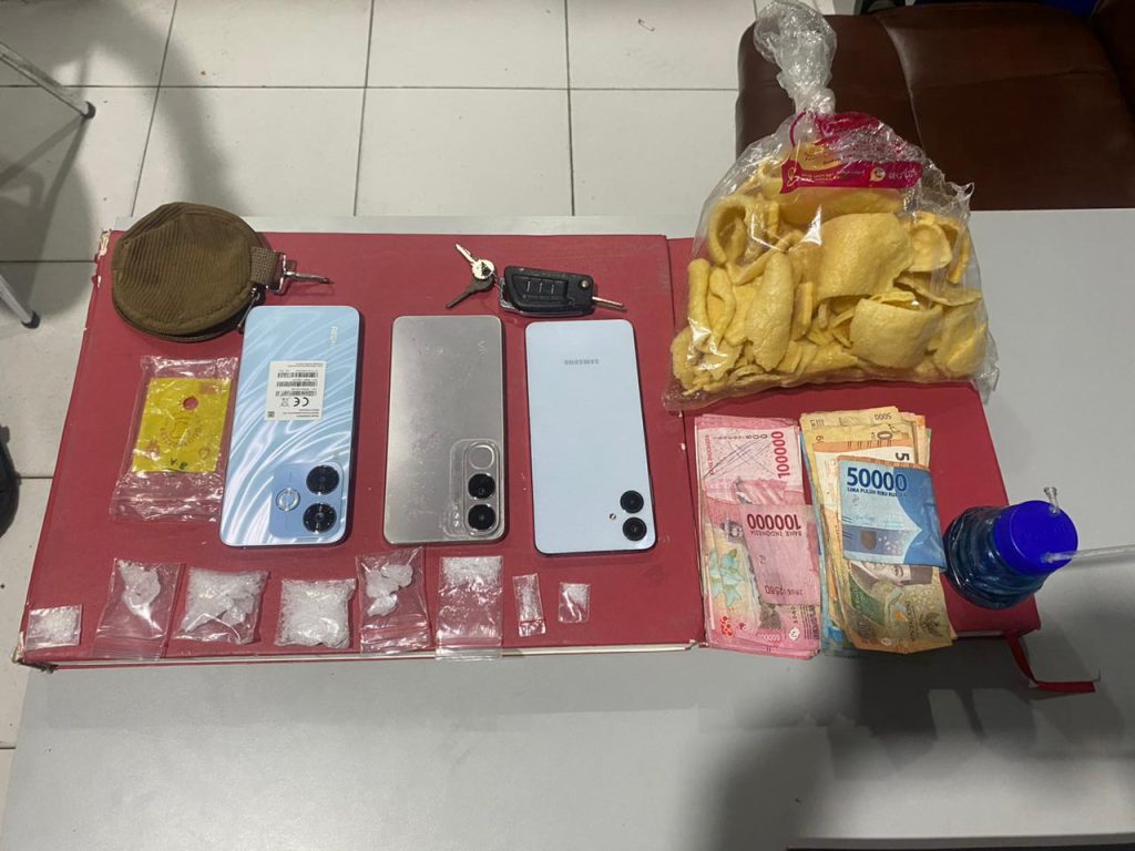 Dari hasil penangkapan dan penggeledahan, petugas berhasil menyita sejumlah barang bukti berupa 5 paket sedang dan 3 paket kecil narkotika jenis sabu dengan berat bruto 17,04 gram. Selain itu, turut diamankan barang bukti lain berupa plastik klip kosong, satu unit bong, dompet kecil, tiga unit telepon genggam, satu unit mobil Toyota Vios warna silver, serta uang tunai sebesar Rp3.100.000.